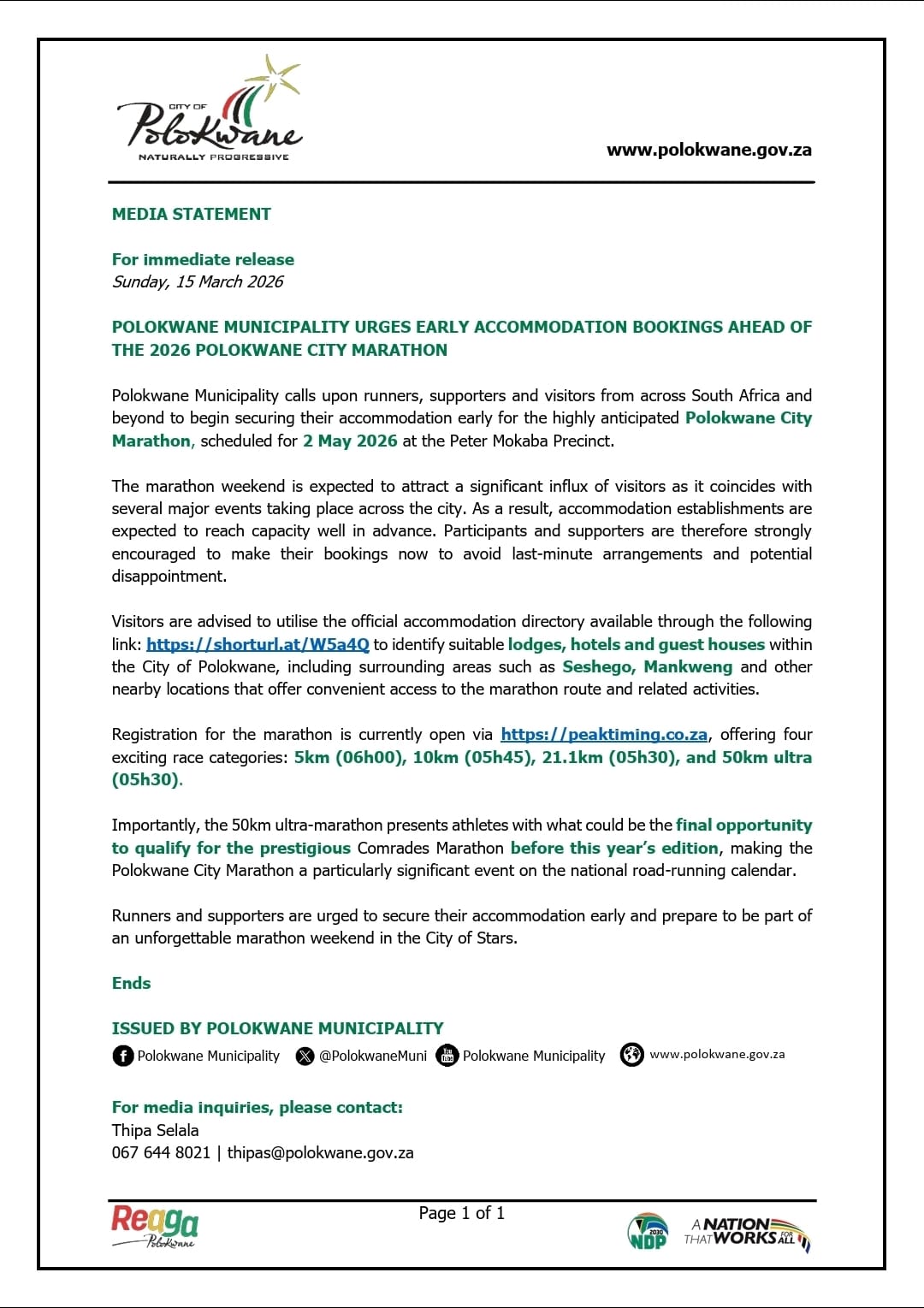 - POLOKWANE MUNICIPALITY URGES EARLY ACCOMMODATION BOOKINGS AHEAD OF THE 2026 POLOKWANE CITY MARATHON
