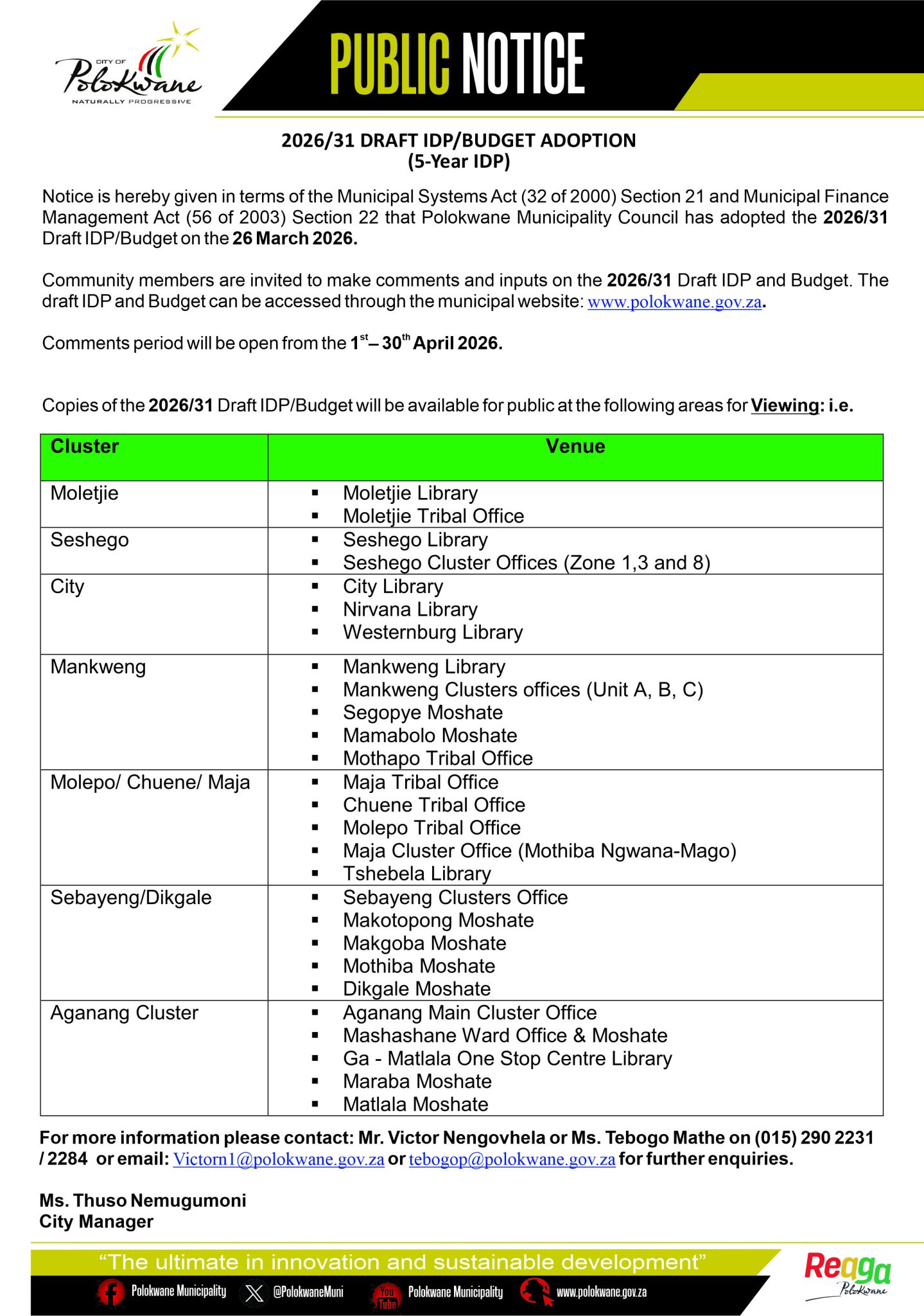 Public Notice – PUBLIC PARTICIPATION SCHEDULE FOR 2026/31 DRAFT IDP/BUDGET (5-Year IDP)